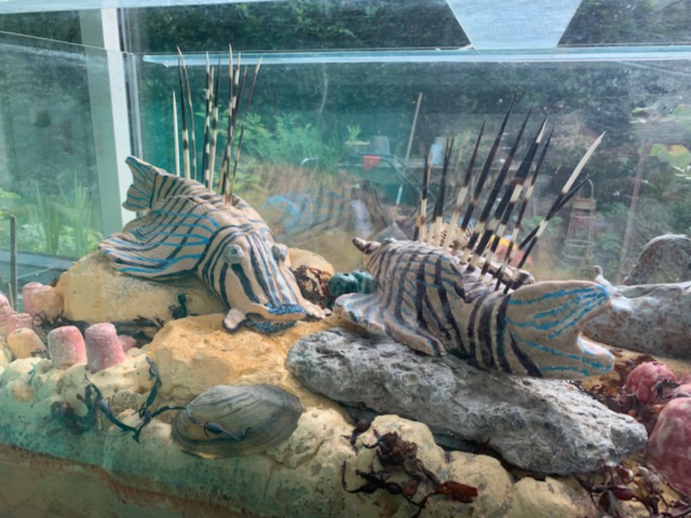 Ook is er een aquarium (125 x 50 cm) te zien, ingericht met keramische (inkt)vissen.